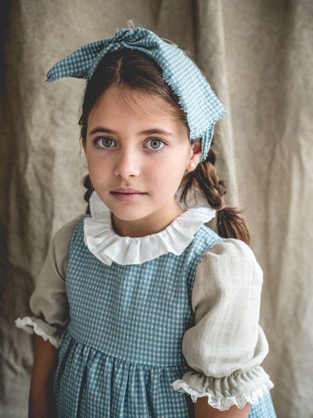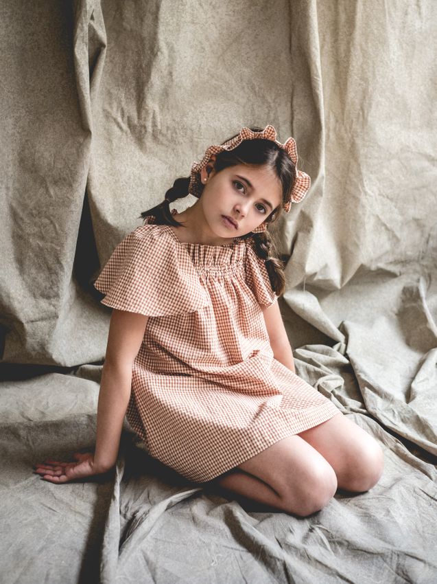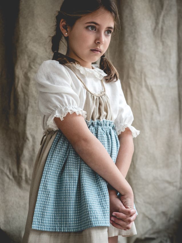 2.9.1 VESTIDO CASA DE LA PRADERA M/F (Coton tostado y vichy. Cuello volante blanco y manga con puntillita)